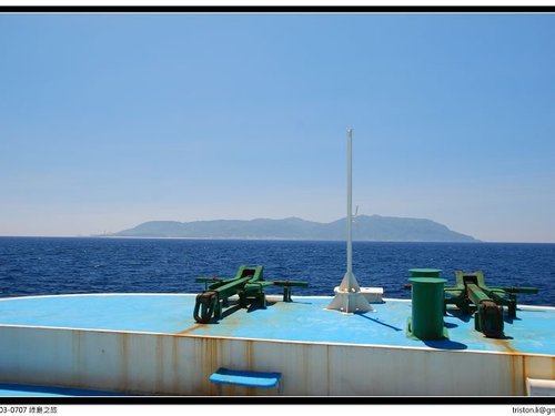 今天天氣晴朗,海上的浪應該不算大,不過上上下下的起伏還是作弄著我的胃,艙內的冷氣吹起來雖然挺舒服,但隨之而來的柴油味還是令人擔心它對我的腸胃翻騰的催化反應,還是忍著船身的顛簸,走到船頭的外頭去曬太陽!