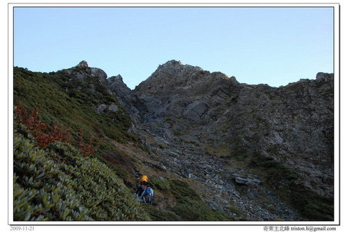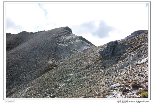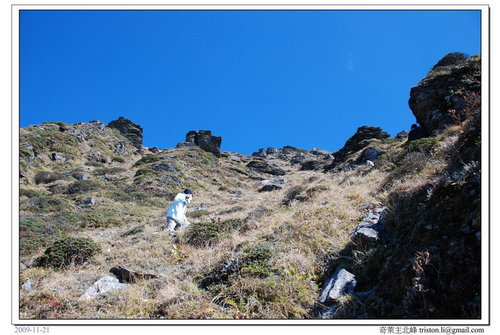 嗯..看到這一片崖壁,..果然還要花一些時間才能上主峰,不管啦,事己至此,向前走就對了.