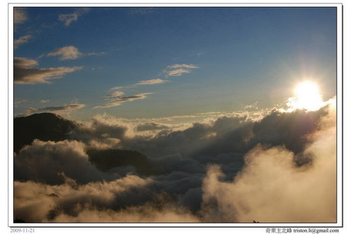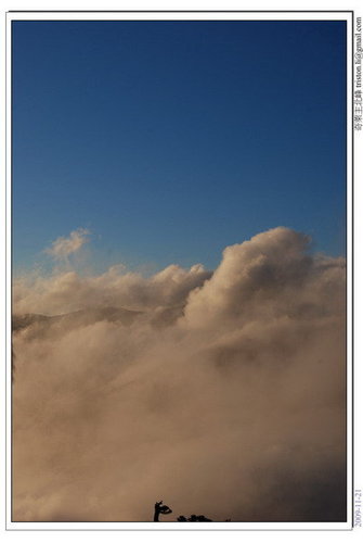 經過了三個多小時的努力,終於到了稜線,日出東方,層層的雲海,美極了,都忘了自己是站在山巔,還是海濱!有點茫茫然,想要縱身一跳,翻滾在雲海飄渺中.