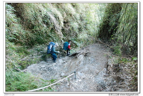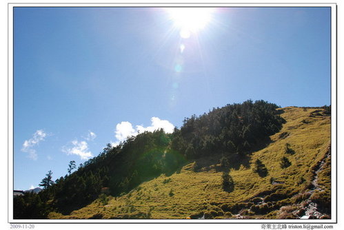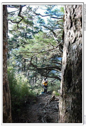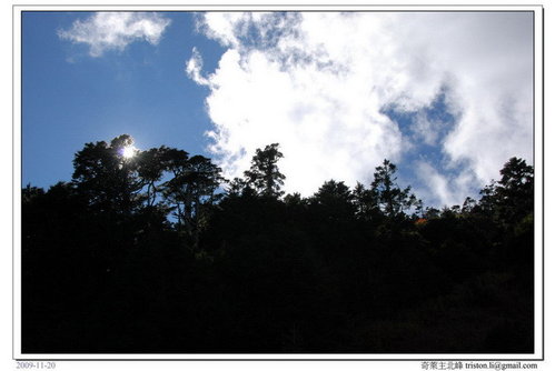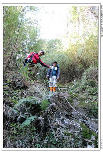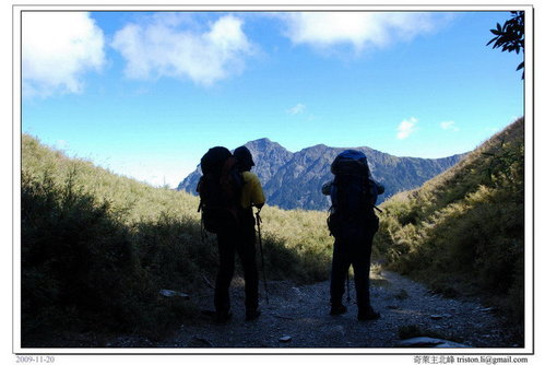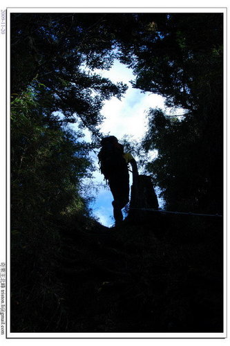 不知幾年前看過一本雜誌,有一張旅人背著背包由陰暗的樹林中邁向光明的草原,雖然背上的行囊看似沉重,身型也有些痀僂,但是那種向前行的背影實在令人感動,所以每次爬山時,我就愛拍些同伴的背影,看著大家一步步緩緩的前行,信心就會由然生起..