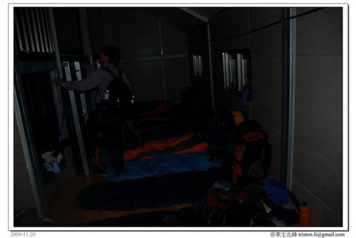 這是山屋內部..成功山屋還不錯..地板竟然有軟墊..太幸福了...不要再白痴的問我有沒有套房或去哪裡洗澡的問題了好嗎??沒水沒電..其實水還蠻方便..因為山屋就在乾河床邊..還有一點小水流.可以煑飯..不用直下直下的到河谷取水..
