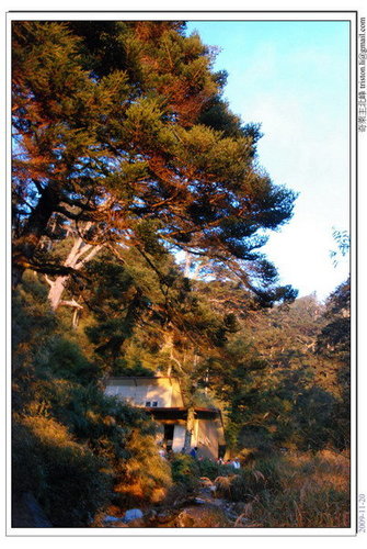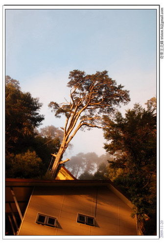 夕陽餘光映在山屋旁的樹上..一片火澄澄的..雖然氣溫不是很高,卻有一股暖暖的感覺..