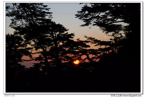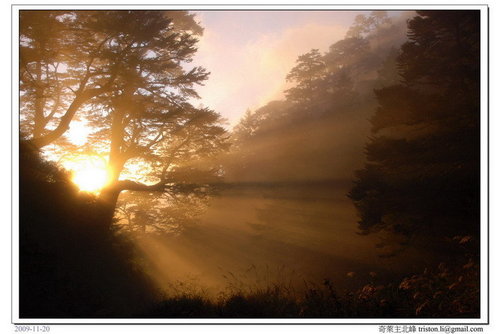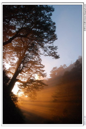 霞光從樹縫中射進來.投影在山嵐霧氣上,形成了一幅由橘色油墨所潑灑出的亮彩..