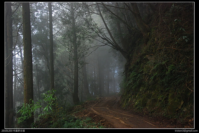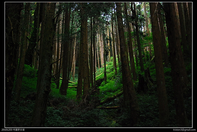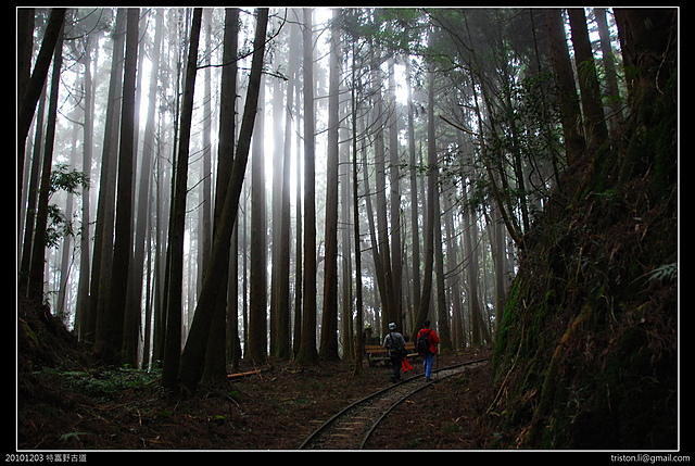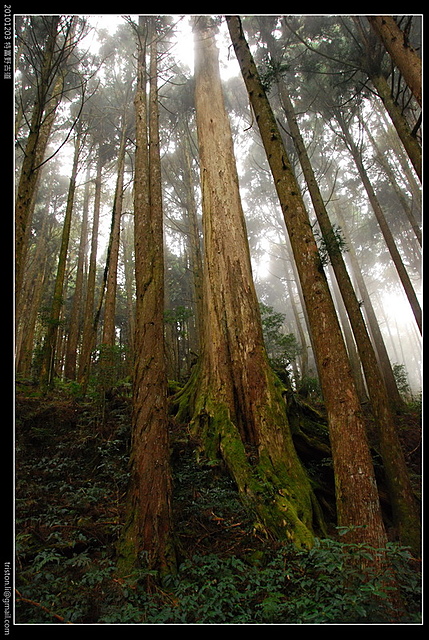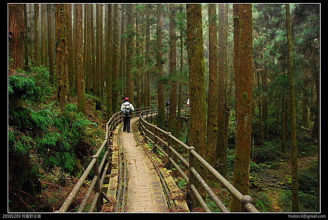 阿里山林區目前大多是人造的柳杉林,陽光從林間洒落,宛入童話故事中小紅帽往外婆家的路上