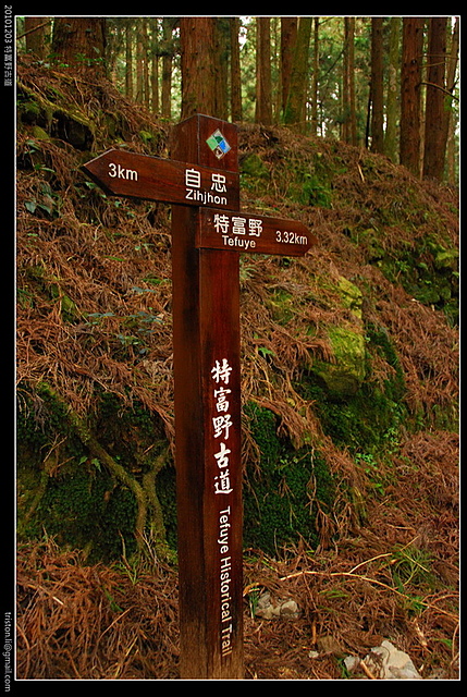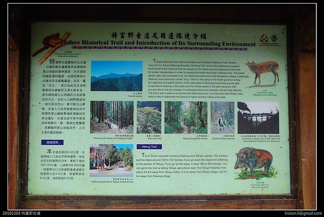 特富野古道原來是阿里山森林鐵路的水山線。特富野古道舊稱水山古道,日據時期日本人為了開發阿里山地區的森林資源,在古道前段鋪設運材鐵道,這段鐵道稱為”水山線”。附近也可以登”兒玉山”和”東水山”.聽說”自忠”原名「兒玉」,看來是為了紀念日本時代的台灣總督兒玉源太郎,不過後來稱”自忠”,一聽而知是為了”紀念抗日將軍”張自忠”,一朝天子一朝臣,從地名的更迭一望可知。特富野古道全程6.32公里,不過我們今天只打算走前段的3.68K,後段陡下陡上,看來時間是來不及了.