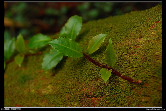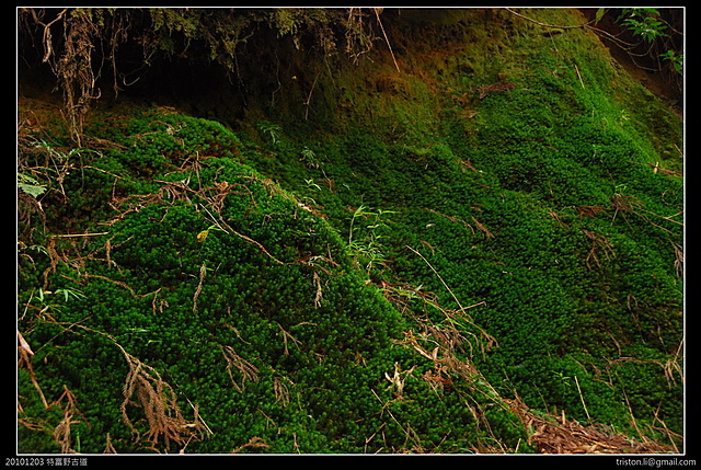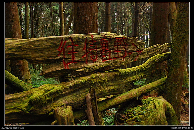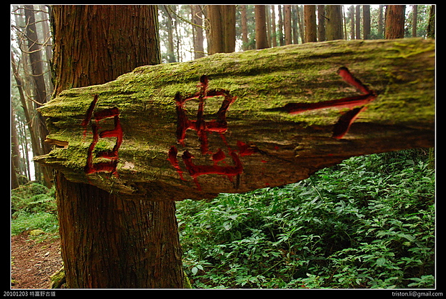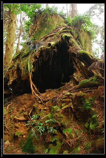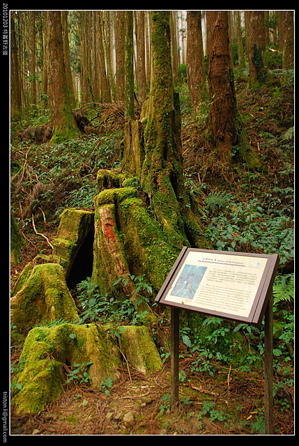 往東水山的登山口,己經看不太到路徑了,紅檜的根部切口長滿了綠苔