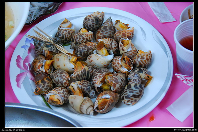 烤風螺?這個螺比風螺好像大一點,但又沒有”苦螺”那麼大,不過雖然大顆,倒不會變的死硬,螺肉軟軟脆脆的,烤的也很到味,一叉就出來了..