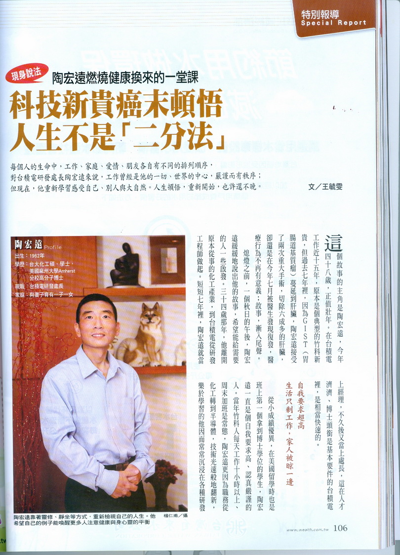 TSMC 研發處主管陶宏遠( 處長) 癌症末期去逝,才40幾歲,小孩不到10 歲,他就是那種為公司賣命的人, 所以不到50就升到處長.各位,多注意自己身體,要保養,多運動, 要work-life balance, 不要為公司賣命,公司不會心疼你的.前扑後繼,沒了陶宏遠, 還有別人, TSMC 從沒因某人而怎樣, 但你怎樣的話, 你的人生, 家庭就毀了...想想看, 陶宏遠他妻兒怎麼辦?