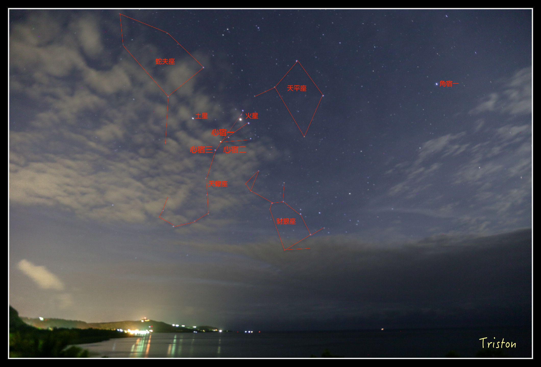 火星在心宿二附近徊徘,典型的熒惑守心,熒惑是火星,從地球上看,由於地球繞太陽公轉的速度快於火星。當地球在軌道上「遠離」火星時,火星看似順行。當地球「接近」火星的時候,火星變為「逆行」。火星在天空中運行,或順或逆。順行的時候和逆行的時候,火星運行的速度看來較快,而在順行和逆行的轉折期間,看似行進速度較慢,這個緩慢的轉向過程,就叫做"留",當留發生心宿區域,就叫"熒惑守心"。熒惑在心宿中由運行方向的變易常常被認為是「大人易政,主去其宮」的徵兆.....所以,我們今年換總統了嘛!