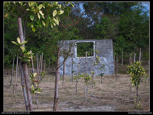 營舍舊址。現在營舍內部都己經清理一空,日後大概還會布置一些展示。營區的前半段,樹木維持的很好,不過到了營區內部,或許因為地質關係,樹長的並不好,這幾年彌陀鄉公所大力在進行綠化。