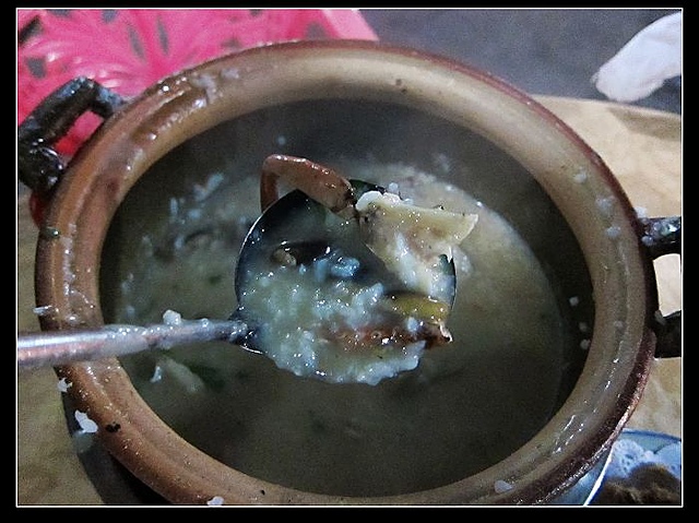 重頭戲。沙蟹肉粥,熬的很爛,看起來雖然米粒還很分明,但是入口其實都沒有粒粒的感覺了,幾乎不是吃進去,而是喝進去,口味也控制的很清淡,所以太家都吃了好幾碗,難怪我同事每次出差都會來好幾次!