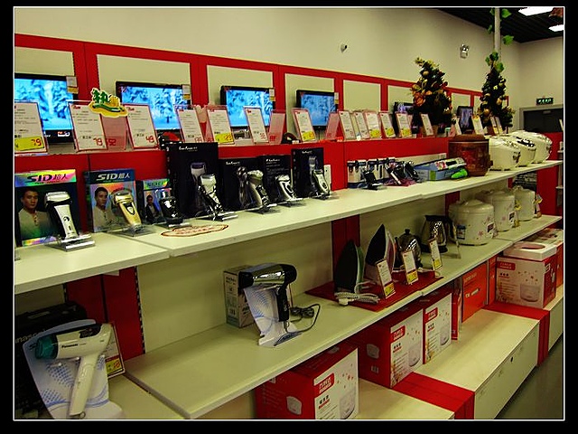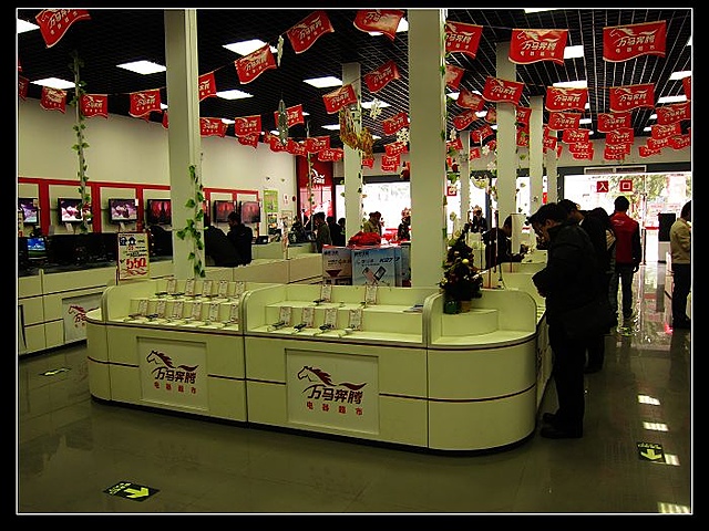 萬馬奔騰電氣超市內賣的應該都是鴻海集團幫各品牌廠代工的商品吧..除了一般熟知的3C產品,如筆記型電腦和手機,液晶電視外,也有吹風機,刮鬍刀,電子鍋和豆漿機,幾乎就像是台灣的全國電子一樣,不過不知是不是剛踏入家電零售領域,在導引標示或天花板的垂直吊飾都稍嫌稀疏,沒有"熱鬧"的感覺!和"華強北"或"全國電子"及"燦坤"就有點差異。