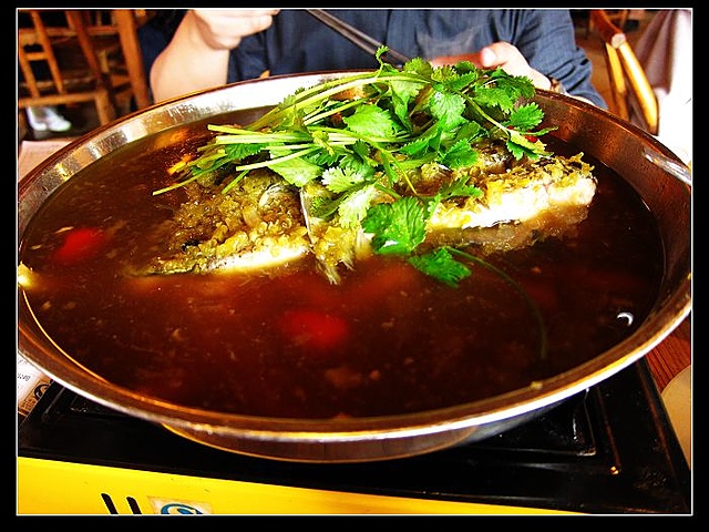 鐵板魚塊,看來不錯吃,吃起來也不錯,可能是草魚吧,上了點辣椒,又舖了香菜,魚的鮮味嚐不太出來,不過魚肉還挺嫩的!