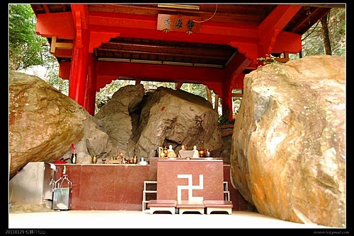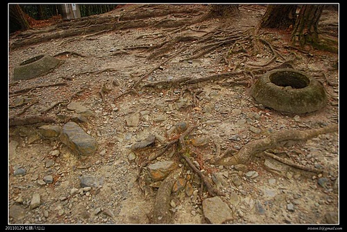 出了竹林後,是神社遺址,不過神社已經不在,只在原址留下兩個基座孔,應該是鳥居的吧!不過整座神社都不見了,只剩下一座涼亭.