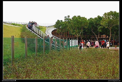 青青步道是這次花博之行較扼腕的遺憾!因為它位於天使生活館和未來館的屋頂,以植被作為天使生活館的屋頂,並輔以太陽能發電板,原本看資料表示是適合看夕陽的地點,原本安排看完”毛毛蟲大遊行”再來的,不過後來發現青青步道四點就關閉,而且隔天又下雨也關閉,成為這次花博行的遺憾!