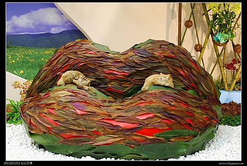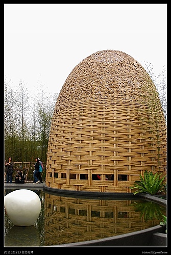 寰宇庭園區的台灣園-是由手工編織的竹編甬道再進入穀倉的飽滿空間,但是我不太懂那些白色的粒狀物是具象的形容盈滿的米粒,還是抽象的什麼東西啊!!