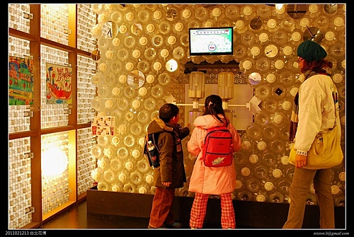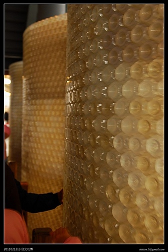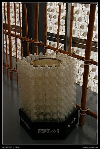 挑高透風的一樓,講解說是向東北開口,可以迎接東北方向來的季風,外牆還有由高處向下流落的水幕,可以產生降溫的效果,當然2/13那天蠻冷的,水幕也沒開啦!經由重新壓出成型的寶特瓶搭成的外牆,現場看壓製後寶特瓶沒有看到明顯的卡榫,不了解它的扣合是用結構扣合,還是要另外上膠呢?而且重新壓製,不知道會不會有反而使用更多能源的問題,如果一開始做為容器使用前,就可以設計成回收待用的結構?例如像樂高積木的概念,會不會讓日後回收及再利用有更寬廣的使用空間?不過透過使用PET再生使用的概念蓋成的這樣一棟大型建物,的確可以提供新一步的建築思考,例如組合式機能型隔熱建材的應用....還挺有趣的....現在做資源回收的都會賺大錢吔!!人棄我取!還可以發錢當首善哦!