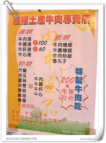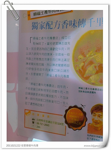 原來它的全名是”順福土產牛肉湯”,口味如何沒試過,不過看它的門面,還找了美鳳有約還有不少電視節目來宣傳,證明這家的老板是有心經營的,這樣代表應該不會太差吧!而且看了幾次,客人好像也都蠻多的!