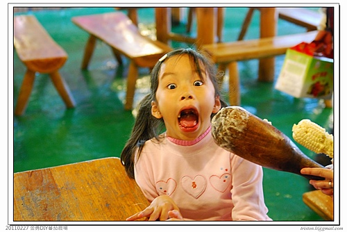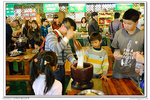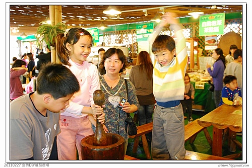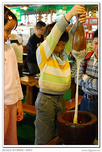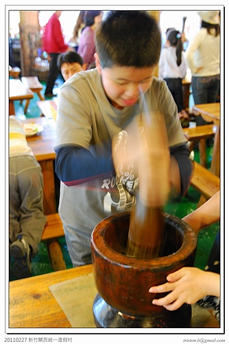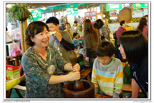 再來就是有趣的搗麻糬囉...去向櫃台買了一碗圓糯米飯,搭配了附屬的工具,150元!大家就開始拚命的搗囉!杵很重吔!!沒兩下子可舉不起來!!瞧兒子那副模樣,多興奮啊!