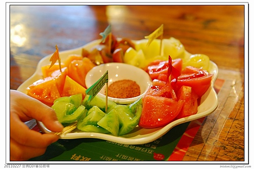 番茄拚盤.100元!其實這裡的番茄並不合我的味,太無味又不會酸,我還是喜歡微酸的番茄!這裡的番茄皮很薄,很細緻,卻不太像番茄哩!可是在地消費是很重要的內需活動哦!要多花一點錢...