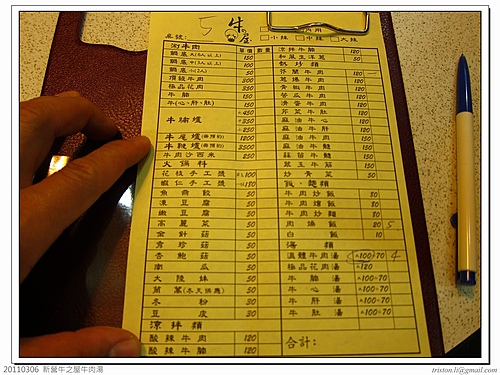 坐定後,仔細看了下它的菜單,發現它其實是以牛肉火鍋為主,湯底定價150,溫體牛肉湯一碗100,價位一般,不過熱炒的菜120,比其它家略貴..