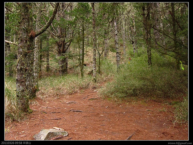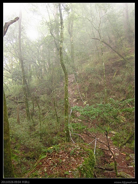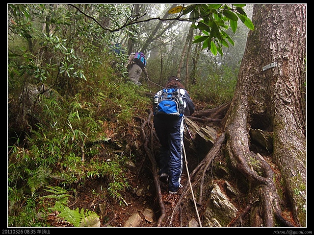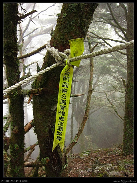 7:30 羊頭山雖然說是百岳中的老么,標高也才3035米,甚至比許多山的登山口都還低,由登山口到三角點雖然4.1k,不過可一點都不能看輕它,在短短的4.1K中,就得上升近1000米的高度,再加上許多陡上直下的路程,沒那麼輕鬆!一般來說,平路一小時可以步行4~5公里,不過羊頭山的話,4.1K花了六個小時以上攻頂的人也挺多的!今天霧這麼濃,看來山頂又是視野佳,但是展望零了...廢話不說,快走吧!天氣有點冷咧!!