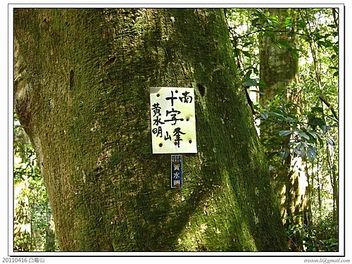 到達一座小平台,樹上釘了一個”南十字峰”的鐵片,署名人竟然就是我們的嚮導”黃水明”先生,更扯的是,回程才發現,原來這裡就是”凸龜山”啦!但是今天的行程並不是到這裡就算了,而是要以此為一起點,做一個O型縱走,下到阿里山鐵路,用餐後再拉回來,然後才能班師回朝!