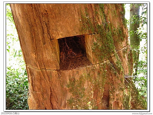 路旁的樹被切了一個方孔,又做了一圈環切,由方孔往內看,整棵樹心都爛了,大概是山老鼠要盗伐這個樹,砍到一半發現樹的材質有異,取樣後又發現樹的材質不佳,索性放棄!果不其然,我們就在離樹不遠的地方發現了被切下的方塊!不過被這樣鋸了一圈,這棵樹也死定了....