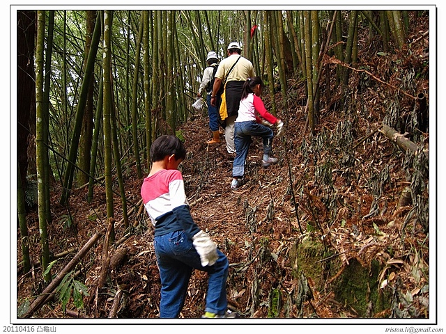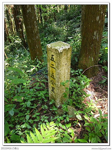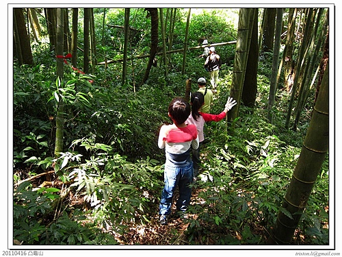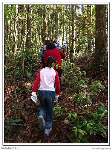 今天來爬這座山的成員有30多個人,成員好像和公司之前去牡丹池山的人有點不同,大概是因為把登山難度定在”國小高年級以上”吧,所以退卻的人也變多了......由公路往凸龜山其實不遠,太約走半個多小時就到了,沿路山徑還可以辨識,不過來這裡的人應該不多,即使偶爾出現的登山隊布條,也都是一段時間之前綁的,全程都在原始林和杉木林中行走,林木雖然不能說濃蔭蔽天,但也算涼爽怡人,至少不是什麼豔陽直曬,悶到爆的行程.