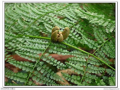 怪異的蕨類了長了奇怪的果實,回家請示google大神後,才知道是"碗蕨科"的"稀子蕨",資料說它是冰河期的孓遺生物,生長在由喜馬拉雅山,中南半島和台灣的山區,還可以治感冒發熱,風濕骨痛。葉面上奇怪的果實其實是它的”不定芽”,不定芽其實也是一種無性生殖的複製技術,看來,動物界我最佩服的是”蟑螂”,植物界則可以頒給”蕨類”了!