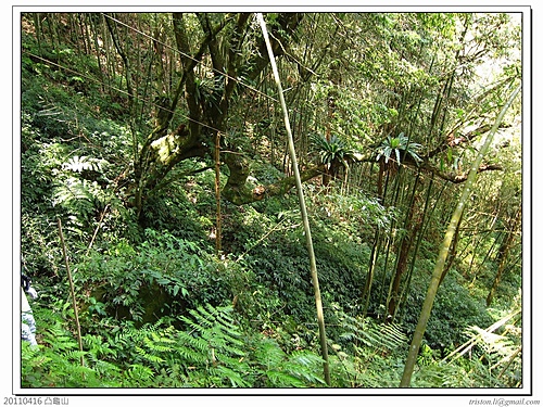 竹木裡出現了幾條流籠用的鋼索,看來這裡平常還是有竹農來採採竹筍和鋸一些竹子下山的,樹上的橫幹上長了兩棵好大的山蘇.同事還有人採來當做中午泡麵的加菜,野生無毒的山蘇果然清甜可口!