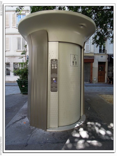 今天早上看完羅浮宮的人龍後,轉往有名的巴士底市集去溜達溜達,那可是星期日才有的市集,一出Bostille地鐵站,就看到路旁立了一個膠囊狀的鋁盒,這是Toilettes,就是路邊廁所,前兩天在艾菲爾鐵塔那附近也遇到過,當時還大排長龍呢!那時心裡還暗笑,這群人是怎麼了,都忍不住了嗎?路邊就撒起來了….