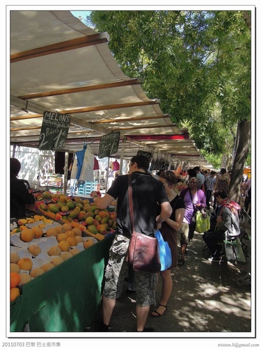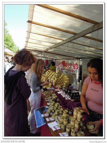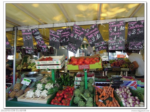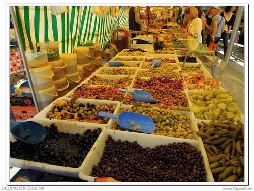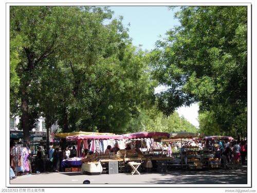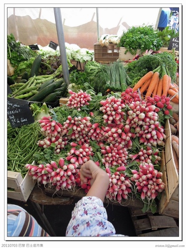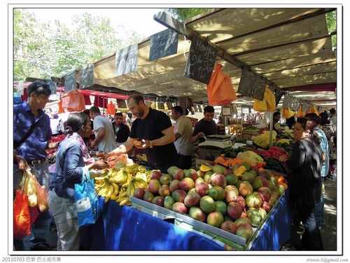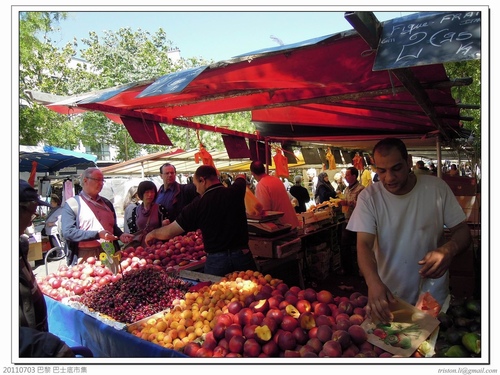 巴士底市集,雖然沒有五顏六色的紀念品和成群結隊的旅行團,卻有道地的農產品和各式各樣特色小吃攤,五顏六色的蔬果攤,雖然己經近收攤的十二點多,不過還是擠滿了來採買的巴黎當地人,他們有推著小車,有的就近把腳踏車鎖在附近公園的鐵欄杆上,今天就假裝自己也是個浪漫的巴黎人,戴著墨鏡,偷看一下迎面而來的美女和推著嬰兒車的法國正媽,順便張羅一下今天的午餐!
