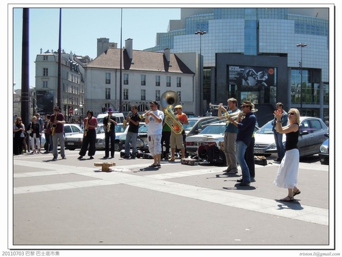 巴士底廣場旁的理查勒諾大道(Bd Richard Lenoir),是條林蔭大道,一到週日就成了巴黎人最愛的巴士底市集,市集的入口處,也常有音樂性的活動!今天就有爵士樂街頭表演!映著後頭的巴士底歌劇院,巴黎果真是個笙歌處處的城市...