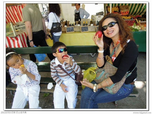 法國人買東西當然也是挑三揀四,東試西嚐後再殺價,那紅的,黃的發亮的甜桃,還有成堆的櫻桃