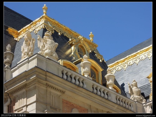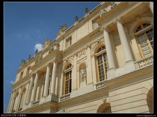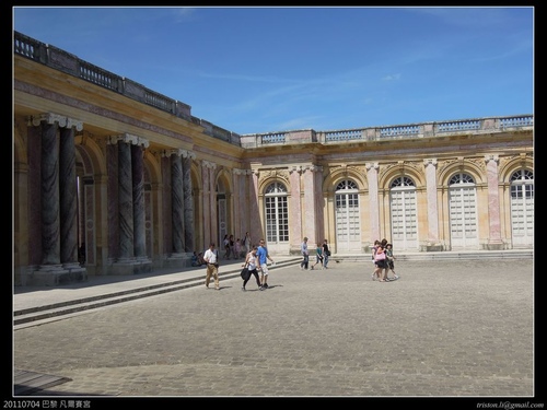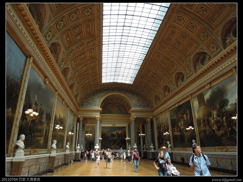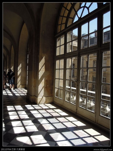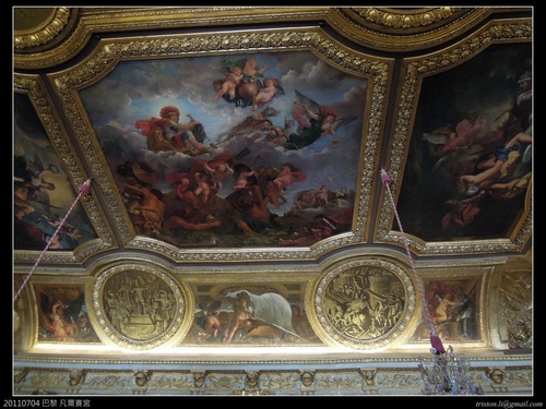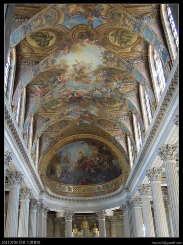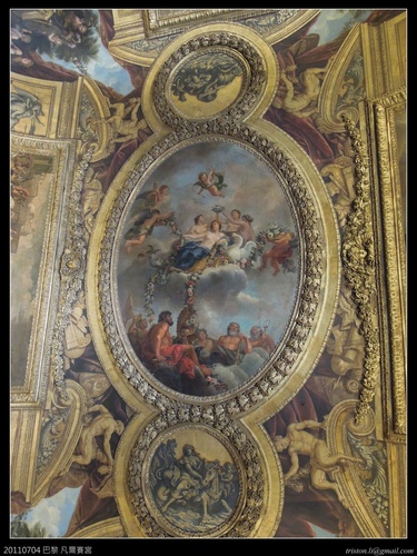 依著遊客的動線或人潮向前推進,其實平面的東西恐怕都被清空,可以看的大都是凡爾賽宮的古典建築本身,它有部分是採巴洛克式建築,也有部份採洛可可式建築!我們可以看的大概也就是天花板和柱石廊道的裝飾!