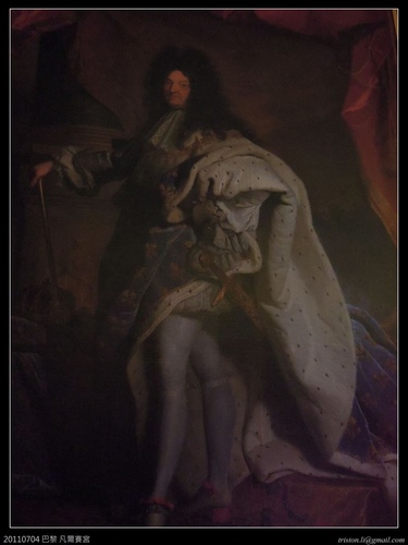 這位穿著藍色絲襪,踩著紅色高跟鞋的就是路易十四世,他在位竟然長達七十二年,應該是歷史可考的皇帝當最久的,和乾隆在中國的地位相當,還真是做不久還搞不出什麼花樣來!