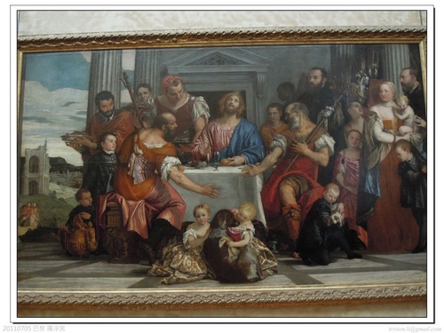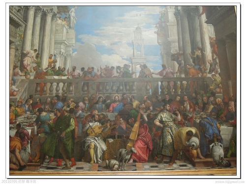 蒙娜麗莎對面的這幅書上說的是”迦納的婚禮”的故事,可我聽旁邊的大陸導遊一直說耶穌顯神蹟的故事。20121107補充:剛好讀到部份資料,原來是自己知識太貧,迦納的婚禮是耶穌第一次顯神蹟的地方:在約翰福音中記載說耶穌和他的門徒一同參加在迦拿舉行的一場猶太婚禮。當主人的酒用盡時,耶穌的母親告訴耶穌說,「他們沒有酒了。」耶穌回答說,「婦人,這與我與你有什麼相干?我的時候還沒有到。」耶穌的母親對僕人說,「他告訴你們什麼,你們就做什麼。」(約翰福音 2章3-5節)。