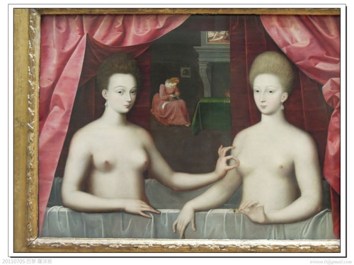 這一幅的描述很好笑,一對姐妹在玩弄彼此乳房,還稱讚說你的乳房是最美的哦..