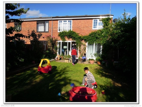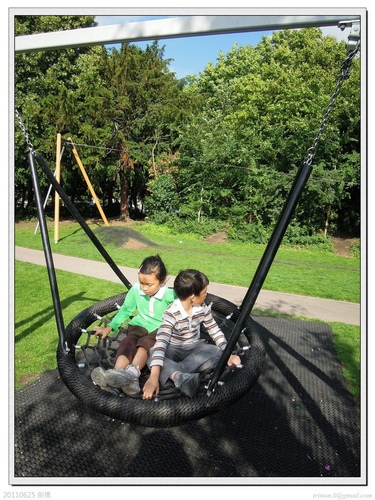教堂的對面是一大片綠意盎然的公園,五點多的傍晚(其實也不是傍晚,因為十點才天黑),社區的小朋友都和爸爸媽媽出來玩耍,我們這兩個也不落人後的去體驗一下英國兒童的遊樂設施