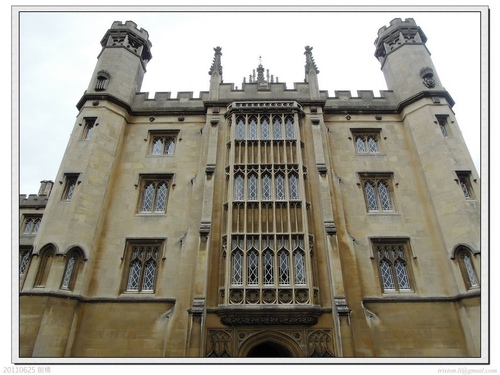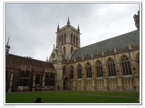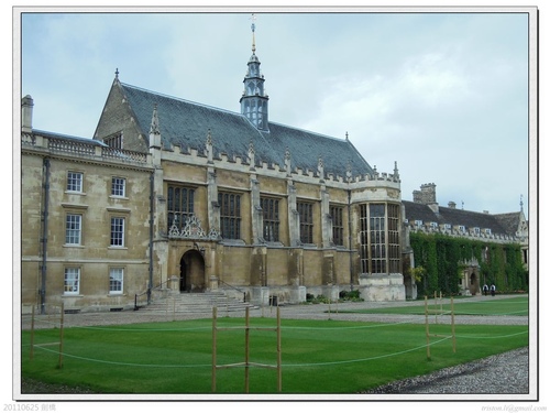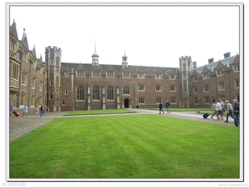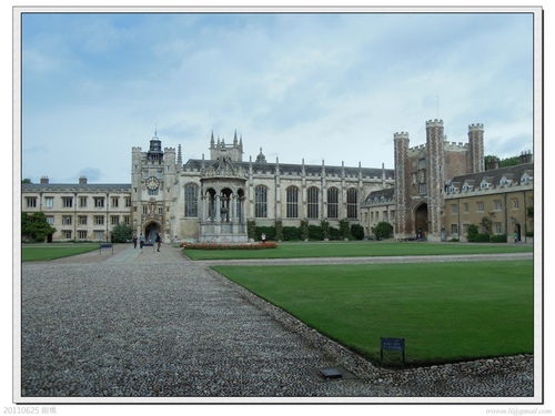 其實劍橋大學中各學院的建築配置都挺雷同,一個口字型的學院中庭,然後會有個十字型的東西南北向道路,然後草皮座落四角..