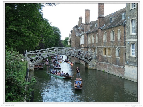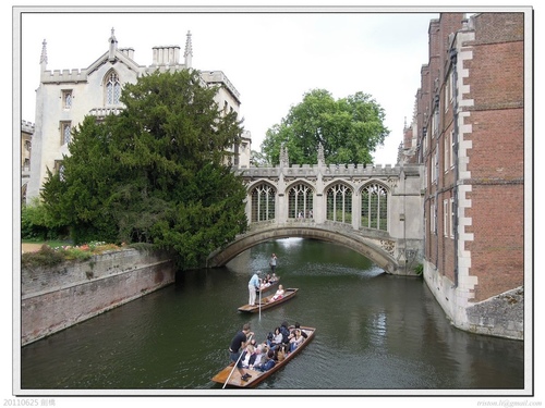 走出聖約翰學院,就是著名的Bridge of sighs嘆息橋,St. John College的後頭看來是學生宿舍區,那考試期間,是從寢室走進教室,還是教室走回寢室,會嘆息連連呢?我記得唸高中時有一件趣事,全班考完數學不但嘆息連連,還叫苦連夭,惟獨有位老兄還鬼叫著”怎麼考這麼簡單”!事後全班竟只有一人及格,就是這位老兄,還考了九十幾分,真該毒打一頓,所以嘆息橋也該改名為阿魯巴橋了。