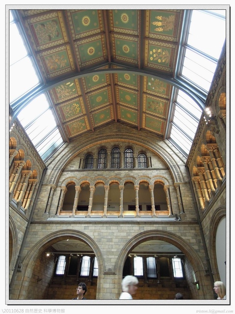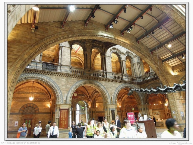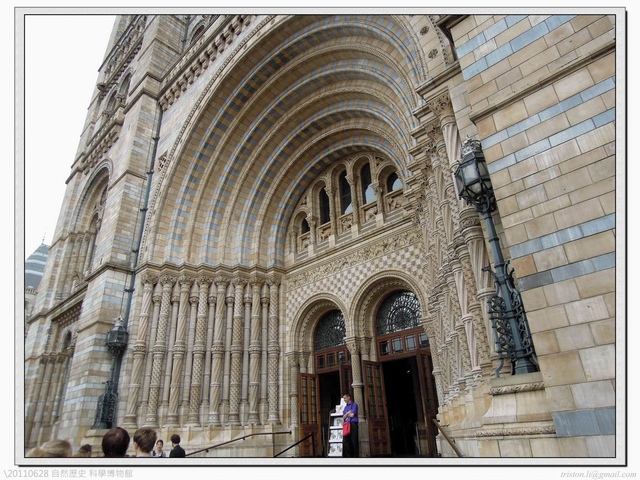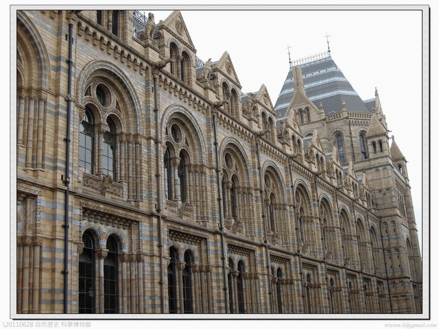 倫敦自然歷史博物館Natural History Museum,當年歐洲各國的野心家假探險之名在世界各地刧掠,自海外攜回大量標本,西元1881年,自然歷史博物館由大英博物館獨立建館,興建了這座羅馬式建築,如果仔細看它的雨漏和陽台廊柱,可以看到是一座座的動物型雕刻!
