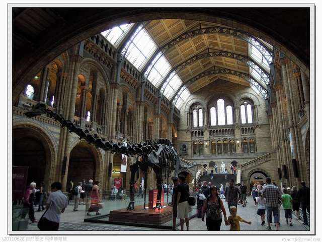 自然歷史博物館有五個館:植物館、礦物館、昆蟲館、古生物館及動物館。大約有近七千萬個展示品。其中最有名的是達爾文在世界各地收集回來的動植物標本。大廳是一件碩大的梁龍標本,雖然是複製品,不過長達26米還是很震撼,小朋友就是愛這味啦!
