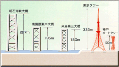 明石海峽大橋擁有世界第三高的橋塔,高達297公尺,僅次於法國米約高架橋(342公尺)以及中國蘇通長江公路大橋(306公尺),比日本第二高大樓橫濱地標大廈(295.8公尺)還高。常來日本就知道,日本人最喜歡搞些日本一,世界一,很自大又自卑的矛盾性格吧!總愛用些最大最高第一的來膨脹一下