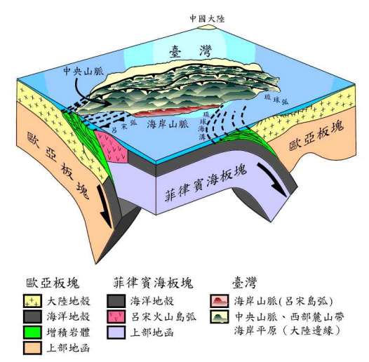 台灣島位於歐亞大陸板塊和菲律賓海板塊交界處,菲律賓海板塊往西北方移動撞擊歐亞大陸板塊。2000~500萬年前,南中國海方向的歐亞大陸板塊隱沒到菲律賓海板塊之下,熾熱的岩漿竄升到菲律賓海板塊之上,形成一系列的火山島,也就是今日所見的海岸山脈及綠島、蘭嶼、小蘭嶼等火山島嶼。