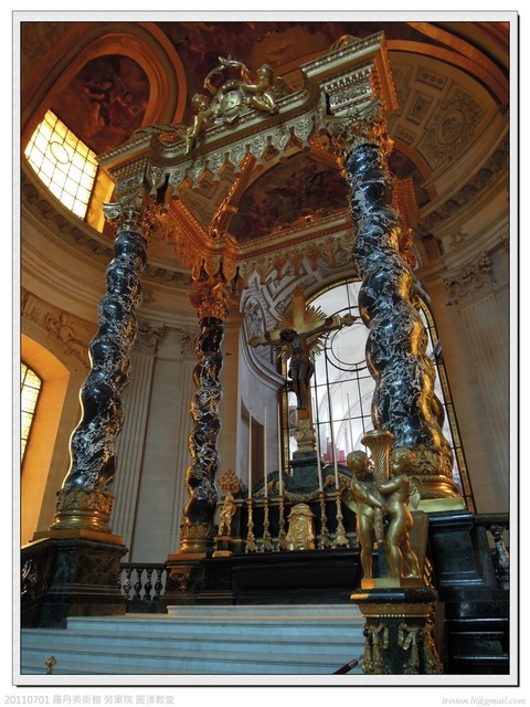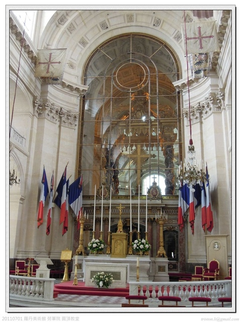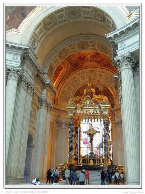 圓頂教堂的正面,圓頂教堂是在1676年,由路易十四下令在當時已經完成的榮軍院後側加建的教堂,在拿破崙當政的時期,教堂被當為軍事偉人的忠烈祠。目前一代法國戰神拿破崙的棺木就擺放於此!