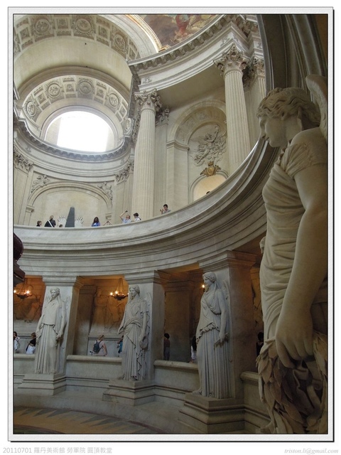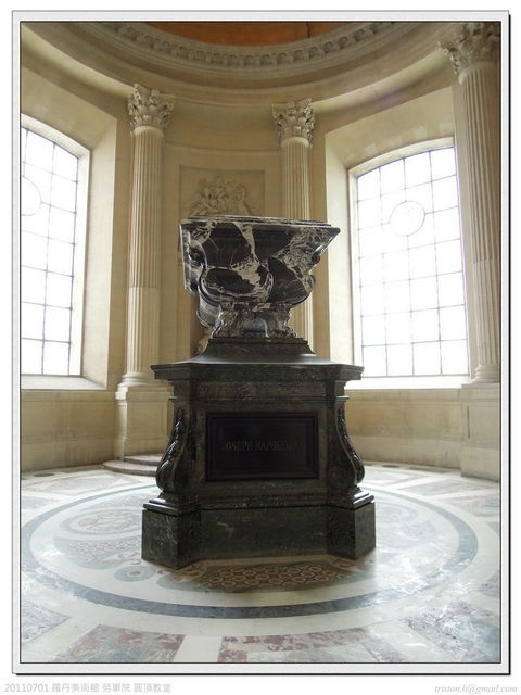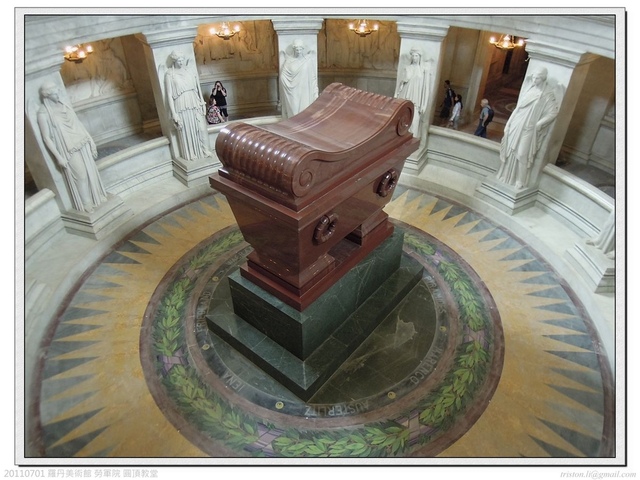 聖路易圓頂教堂(St. Louis)裡最著名的是巴黎無所不在的拿破崙的棺槨,當他的屍骨自聖赫列納島迎回後,法國人很隆重地把他葬在大金頂之下,它的大石棺是用花崗石製成!照中國人的習慣,這種敗軍之將應該不足言勇,不過英雄畢竟是英雄,真正的英雄,成就不在生前,而在身後!棺槨的周圍立著十二位女神雕刻,守衛法國一代戰神