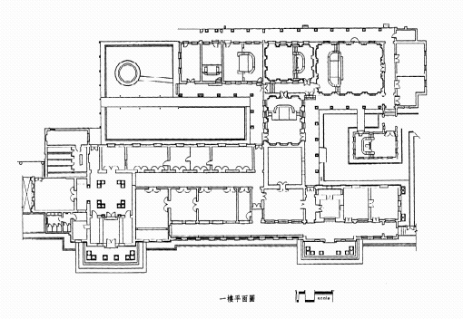 法庭區位於後方,第三、四法庭外走廊區有一排成列的托次坎式圓柱,上部較細,立於方型基座之上。