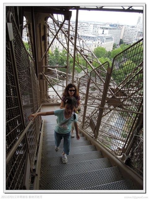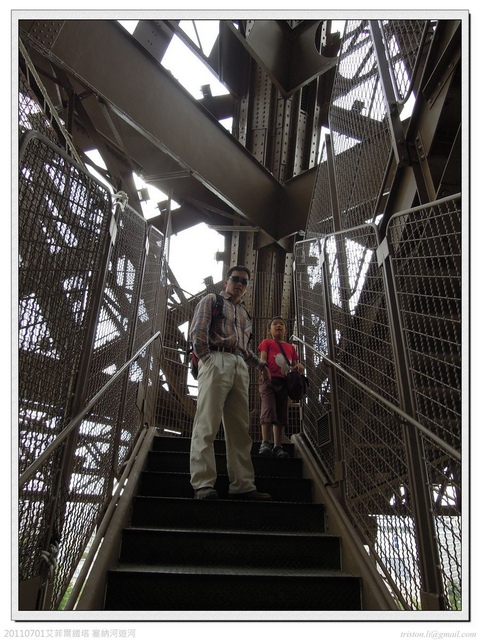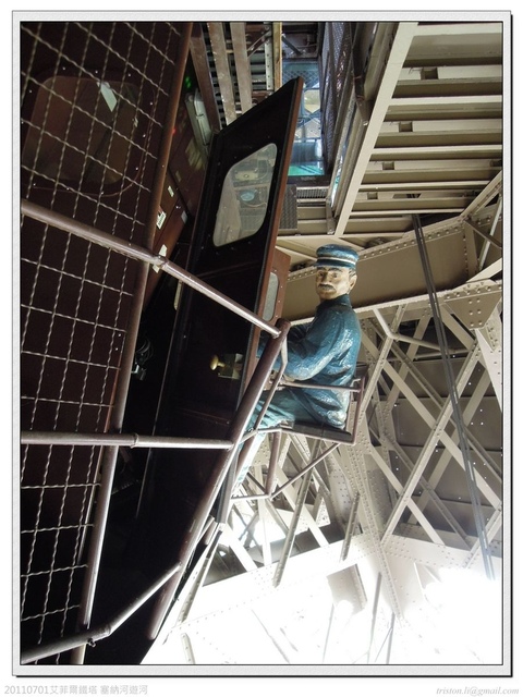 再爬吧!第二層還有一段路呢!怎麼有個人坐在電梯外看我們呢?原來是個唯妙唯肖的假人,看著你們這一群亞洲來的大笨蛋,我們只是用幾根鐵架蓋個艾菲爾鐵塔,做幾個包包,,你們就要拚命工作,再坐大老遠的飛機來花錢,買個LV,GUCCI自己爽的要死,騙自己說好便宜好便宜,真是物超所值,還要買票來爬樓梯,被我這個假人笑!